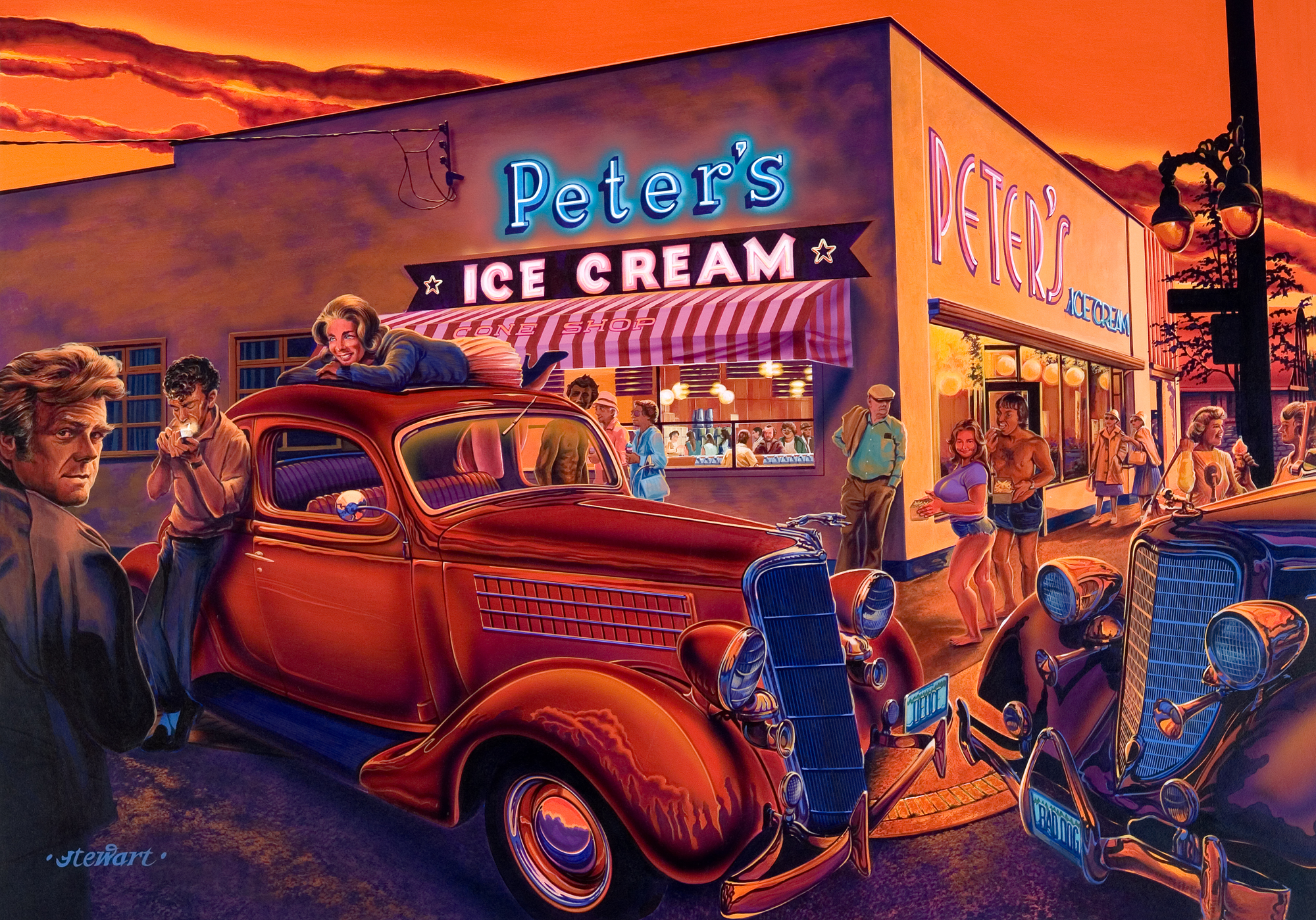 describes the scene as a "multi-era dream". The retro-style lampposts and the blue-jean cutoffs are symbols of the seventies while the clothing and hair styles of those on the left typify the fifties and sixties. The "guy" in the cutoffs is Bruce's friend Brian, and Bruce writes "his galpal is a young lady I once photographed at Kits beach - no exaggeration of her figure by me. [The] girl lying across the deuce coupe is Lesley Gore and the diminutive dude lighting up at the end of the deuce is none other than Gene Vincent (who died from a ruptured stomach ulcer in 1971, age 36). The guy at far left is Red's pal Danny Holiday from KBSG in Seattle, now retired to Stanwood, Wa. All together celebrating a 'cosmic' moment!" |