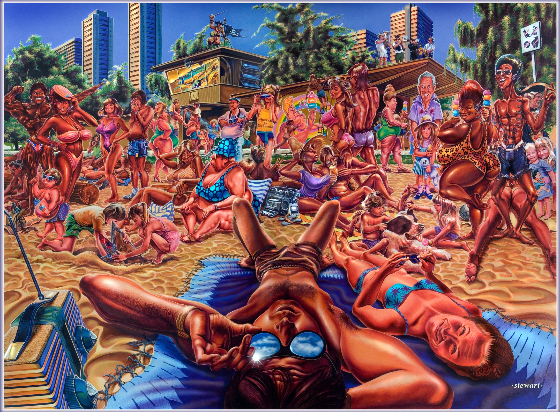 Beach in this Mad-magazine-style painting by Bruce Stewart.